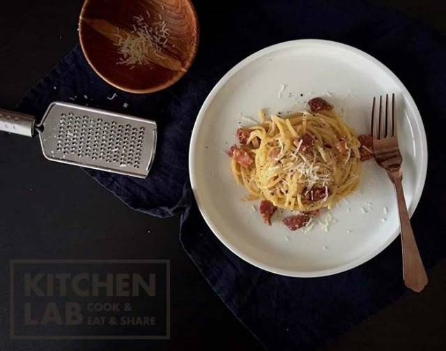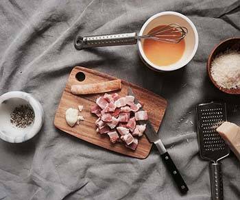 1) 판체타 혹은 두툼한 베이컨을 준비한다. 양질의 치즈와 후추가 카르보나라 맛의 관건이므로 파르미지아노 레지아노나 페코리노 치즈를 쓰는 것이 좋다. 후추는 꼭 통후추로 준비하고 냉장고 속의 달걀은 미리 꺼내어 실온에 둔다.