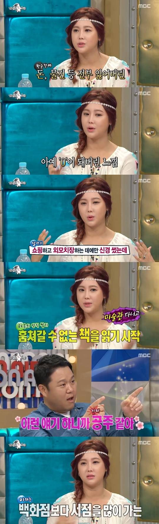 그러나 그녀가 비싼 명품 옷이나 가방 대신 책을 사고, 백화점 대신 미술관을 찾아다니며 이전과 다른 삶을 살게 된 이유는 따로 있었다. 최근 슬럼프에 빠졌을 당시 집에 도둑이 들어 큰 충격과 함께 깨달음을 얻게 됐다는 후문이다.
