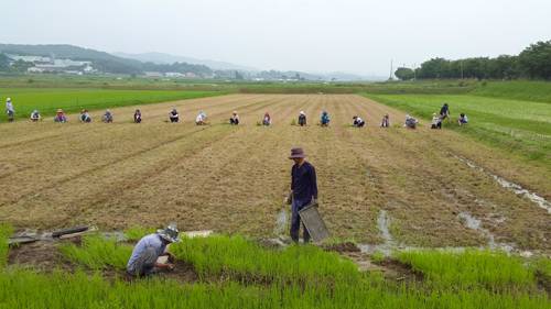 | 자연농법 논에서 모를 심는 도시민들. 농사의 어려움을 몸으로 체험하는 중이다. |
