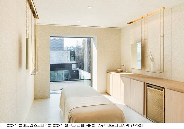 또한 이 플래그십스토어에서는 설화수만의 원료와 처방이 담긴 스파를 만나볼 수 있는데 지하 1층 '설화수 스파'에서는 럭셔리 안티에이징 한방 스파 프로그램을, 지상 4층에 위치한 '설화수 밸런스 스파'에서는 도산공원의 전망을 바라보며 보다 캐주얼한 스파를 즐길 수 있다.