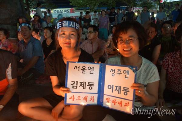 | ▲ 5일 오후 성주군청에서 열린 사드 반대 촛불집회에 방송인 김제동이 참석하자 한 주민이 "서울엔 김제동 성주엔 이재동, 사드 배치 막아내자'라고 쓴 팻말을 들고 있다. |