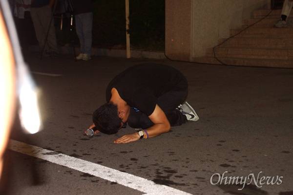 | ▲ 방송인 김제동씨가 5일 오후 성주군청 앞마당에서 열린 사드 반대 성주 촛불집회에 참석해 주민들에게 발언을 한 뒤 큰 절을 하고 있다. |