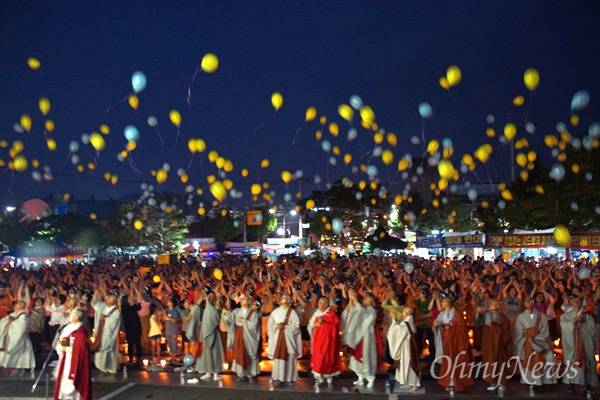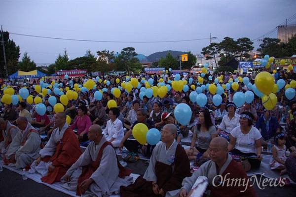 | ▲ 5일 오후 성주군청 앞에서 한반도 평화기원 대법회를 가진 성주불교사원연합회와 신도회가 노란 풍선과 파란 풍선을 하늘로 날려보내고 있다. |