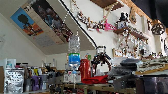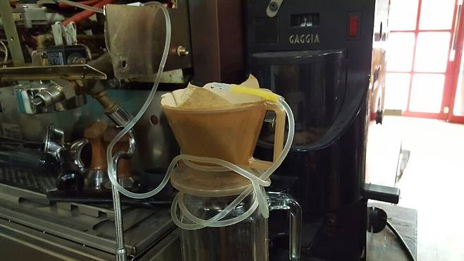 | ▲ 추출되고 있는 콜드브루 콜드브루는 1~2초에 한 방울씩 찬 물을 커피가루에 떨어트려 추출하는 방식이다. 콜드브루를 추출하기 위해 페트병에 링거를 연결해놓고, 한 방울씩 떨어트리는 방식도 있다. |