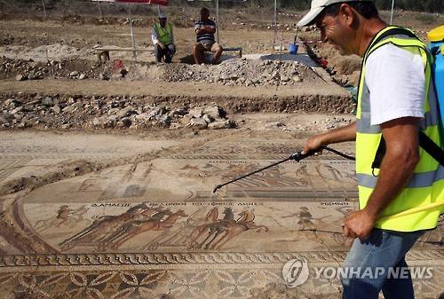 epa05467246 An Antiquities Department staff sprays water on a complete mosaic floor of building remains dated to the first half of the 4th century AD at the Piadhia locality in Akaki village, Nicosia district, Cyprus 09 August 2016. The floor was presented by the Antiquities Department on Tuesday. The floor depicts a chariot scene taking place in the hippodrome. According to archaeologists, the mosaic is unique due to its unparalleled subject matter and high quality. EPA/KATIA CHRISTODOULOU