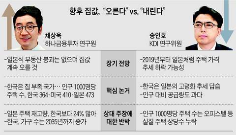 송인호 한국개발연구원(KDI) 연구위원은 "2019년부터 집값이 추세적으로 하락하기 시작할 것"이라며 "서울 집값도 급락은 없겠지만 하방 압력을 피하긴 어렵다"고 전망했다. 그는 한국의 가계 자산 구성이나 인구구조 변화 패턴이 일본의 20여년 전과 비슷하다는 점에 주목했다.