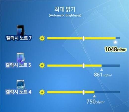 갤럭시노트7 디스플레이는 스마트폰 중 최초로 1000cd/㎡(가로·세로 1m 평면에 촛불 1000개를 켜놓은 밝기) 이상의 밝기를 달성했다. 최대 밝기는 1048cd/㎡로 측정돼 전작인 갤럭시 노트5(861cd/㎡)보다 22%나 높아졌다.