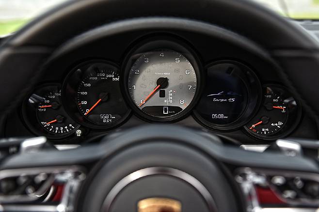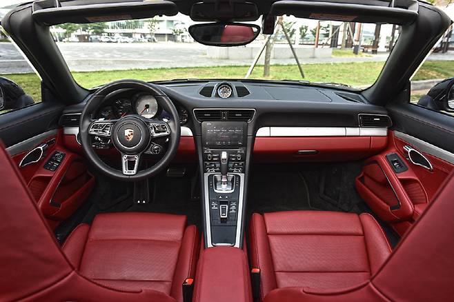 뉴 911 카라레 4S 타르가의 실내 공간은 ‘의심할 여지가 없는’ 911의 실내 공간이다. 평평한 대시보드와 각종 기능이 집중되어 있는 센터페시아가 ‘T’ 형태로 구성된 전통적인 이미지가 고스란히 담겼다. 물론 블랙과 레드 컬러의 투톤 조합이 더욱 역동적인 실내 공간의 이미지를 자아내며 스포츠 드라이빙에 최적화되어 있는 3-스포크 스티어링 휠과 5개의 클러스터를 조합한 계기판은 차량의 정체성을 명확히 설명한다.