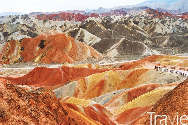 란저우에서 510km 떨어져 있는 장액은 간쑤성 중앙에 위치한 도시다. 한약재인 감초(甘草)가 많이 나 ‘간저우감주, 甘州’라고 불리던 시절이 있었다. ‘감甘’ 자는 간쑤성의 앞 글자가 되었다. 이곳에 장액단하국가지질공원(張掖丹霞國家地質公園)이라는 정식 이름을 가진 아름다운 땅이 있다. 오랜 시간 침식과 퇴적을 거쳐 드러난 속살이 제 성질대로 색을 뽐내는 거대한 지형. 별명은 중국의 그랜드캐니언, 사람들은 이곳을 `칠채산'이라고 부른다. 일곱 개의 색이 일흔 개의 빛으로 갈라져 너울대는 풍경을 보고는 이름 참 겸손하다고 생각했다. 무지개가 돌이 됐다고 해도, 곧이들을 풍경이 사방으로 펼쳐졌다. <동방견문록>을 쓴 마르코 폴로가 장액의 풍광에 반해 일 년을 머물렀다더니, 여길 봤나 보다.