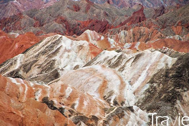 칠채산 관광은 지정된 셔틀버스를 타고 일반에게 개방된 세 개의 전망대를 둘러보는 일정으로 진행됐다. 셔틀버스에는 해설사가 동승해 이런저런 이야기를 들려준다. 지질의 붉은색은 철분이 많아서고, 흰색은 소금이란다. 가만, 소금이라니. 아주 오래전 바다에서 융기했다는 뜻이다. 가늠할 수 없는 시간의 결을 두 눈으로 확인하는 기분이 묘하다.