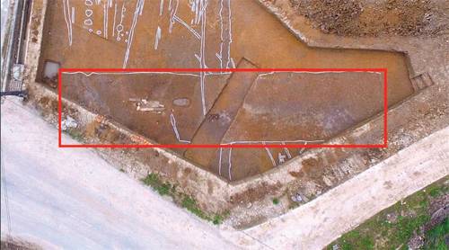 | 전북 익산시 왕궁리 유적 근처에서 발견된 백제시대 왕경 도로(빨간색 실선 안). 하단의 V자형 구조물은 현재의 농로(農路)이고, 왕경 도로 가운데 비스듬히 파인 직사각형의 구덩이는 왕경 도로의 단층 등을 파악하기 위해 판 것이다. 왕경 도로 위쪽에 세로로 그어진 하얀색 실선들은 임시 도로 위에 찍힌 수레바퀴 자국이다. 문화재청 제공 |