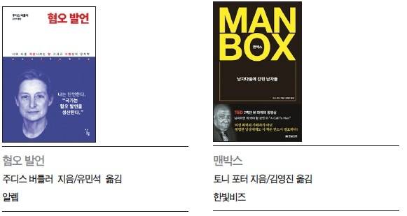 ‘미국에서 가장 유명한 페미니스트’로 소개되는 주디스 버틀러의 ‘혐오발언’과 미국의 사회운동가 토니 포터의 ‘맨박스(Man Box)’가 바로 화제의 책. 그런데 둘은 좀 당혹스럽다. 버틀러는 ‘상처를 주는 말’에 모욕을 느낄 필요가 없다고 말하고, 포터는 ‘선한 남자’가 ‘나쁜 남자’라고 말하고 있기 때문이다.