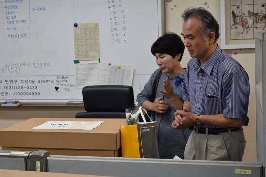 | ▲ 13일 오전 단원고에서 세월호 참사로 희생당한 교사들의 교무실 이전을 앞두고 고 남윤철 교사의 어머니 송경옥씨와 아버지 남수현 충청대 교수가 유품과 추모물품을 정리한 후 두 손을 맞잡고 기도를 하고 있다. |
