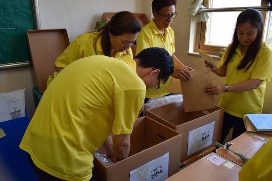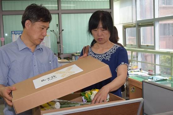| ▲ 13일 오전 단원고에서 세월호 참사로 희생당한 교사들의 교무실 이전을 앞두고 고 전수영 교사의 어머니 최숙란씨와 아버지 전제구씨가 유품과 추모물품 등을 보존상자에 정리하고 있다. |
