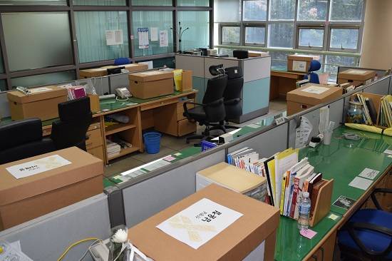 | ▲ 세월호 참사로 제자들과 함께 희생당한 단원고 2학년 교사들의 교무실 이전을 앞두고 유품을 정리한 보존상자가 책상위에 가지런히 놓여 있다. |