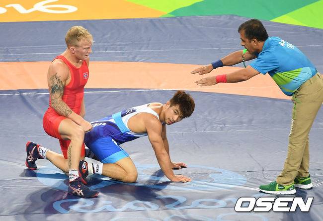 [OSEN=리우데자네이루(브라질), 이대선 기자] 이정백이 14일(한국시각) 브라질 리우데자네이루 카리오카아레나2에서 열린 2016년 리우올림픽 레슬링 남자 그레코로만형 59kg급 예선에서 스티그 안드레 베르게(노르웨이)에게 0대2로 패했다.