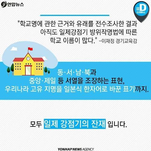 (서울=연합뉴스) 이상서 기자·우태경 인턴기자 = 경기도교육청이 최근 일제강점기의 잔재가 있는 학교 이름을 바꾸는 캠페인을 시작하겠다고 밝혔습니다. 학교에서 쓰이는 여러 명칭과 언어 표현뿐 아니라 조회, 경례 제도 등도 일제강점기 획일화와 애국심 강요의 산물이라는 지적이 많습니다. 우리가 모르는 채 지나간 식민지 시대의 흔적은 살펴보고, '우리의 학교'를 만들려고 노력해야 하지 않을까요?