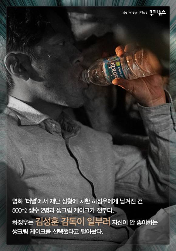 영화 ‘터널’에서 재난 상황에 처한 하정우에게 남겨진 건 500㎖ 생수 2병과 생크림 케이크가 전부다. 하정우는 김성훈 감독이 일부러 자신이 안 좋아하는 생크림 케이크를 선택했다고 털어놨다.