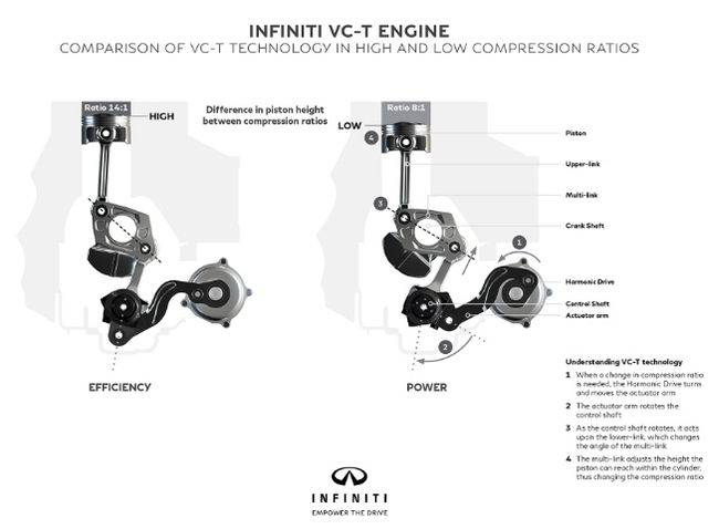 하지만 닛산의 새 엔진은 8:1과 14:1 사이에서 압축비가 수시로 조절 되도록 설계 됐다. 일반적인 가솔린 차량의 압축비는 8:1에서 10:1 정도이고 스포츠카나 경주용 차들은 12:1 또는 그 이상의 압축비를 갖는다.