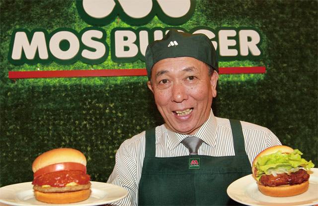 사쿠라다 아쓰시(櫻田厚·61) 일본 모스버거 대표가 2012년 4월 4일 서울 서초동 매장에서 간판 메뉴를 소개하고 있다. <사진 : 이진한 조선일보 기자>