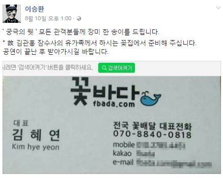 가수 이승환이 고(故) 김관홍 잠수사(42)의 아내가 운영하는 꽃집에서 장미를 구매, 자신의 공연을 본 관객들에게 나눠준 사실이 뒤늦게 알려졌다.
