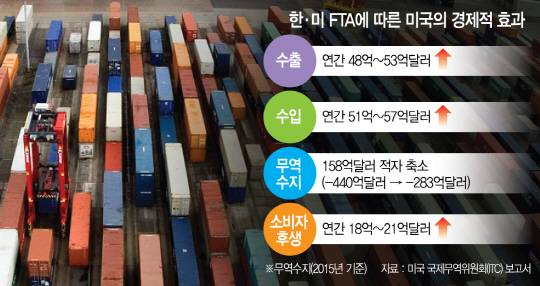 최근 미국 정부 역시 한미 FTA 효과를 긍정적으로 평가하는 보고서를 잇따라 내놓고 있다. USITC가 지난달 29일(이하 현지시간) 발표한 ‘무역협정의 경제적 영향’ 보고서를 보면 한미 FTA는 미국에 연간 48억달러(약 5조6,000억원)의 수출 증가 효과를 안긴 것으로 집계됐다. 이는 242억달러의 수출 증가 효과를 낸 북미자유무역협정(NAFTA)에 이어 집계 대상이 된 13개 FTA 가운데 두 번째로 많은 숫자다. 지난해 미국 입장에서 FTA를 통해 국가별 상품수지가 얼마나 개선됐는지에 대한 항목에서도 한미 FTA는 158억달러의 개선 효과가 있었던 것으로 집계됐다. 이 또한 177억달러인 캐나다와의 상품수지 향상에 이어 두 번째로 큰 액수였다.