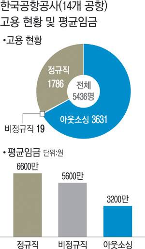 경향신문 취재 결과 한국공항공사가 관리하는 14개 국내 공항은 대부분의 업무를 외주화해 아웃소싱 비율이 67%에 이르렀다. 또한 용역 노동자들은 공사 정규직의 절반에도 못 미치는 저임금을 받고 있는 것으로 나타났다.
