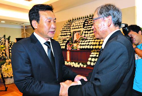 손학규 전 더불어민주당 상임고문(왼쪽)이 19일 오후 서울 종로구 서울대병원 장례식장에 마련된 박형규 목사 빈소에서 상주인 박종렬 목사를 위로하고 있다. 손 전 고문은 자신을 정계에 입문시킨 김영삼 전 대통령의 빈소를 지킬 때처럼 이틀째 이곳에서 상주 역할을 했다. 그는 “박 목사는 제게 가장 큰 영향을 끼친 분”이라고 회고한 뒤 “그분의 뜻을 받들어 나라를 다시 일으켜 세우고 국민들에게 꿈과 희망을 불어넣는 역할을 할 것”이라고 말했다.