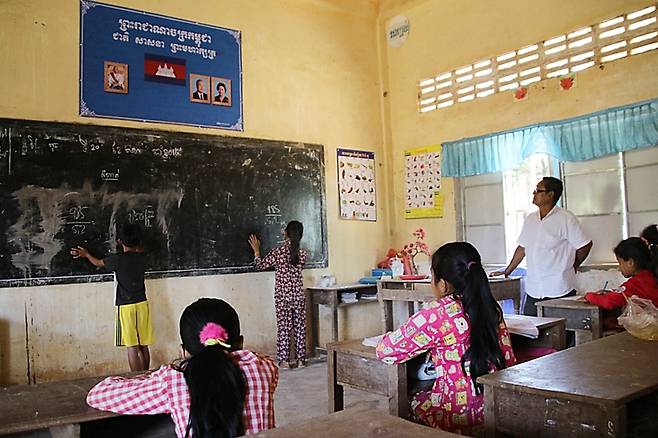 | ▲ 캄보디아 시골 초등학교 수업 모습. 현지 교육전문가들은 한국 대학생 봉사단체의 단기수업프로그램이 오히려 아이들의 수업권과 교사들이 교육권리를 침해한다고 지적한다. |