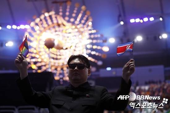 [엑스포츠뉴스 특별취재팀] 2016 리우데자네이루 올림픽의 폐막식이 22일 오전(한국시간) 브라질 리우데자네이루 마라카낭 경기장에서 열린 가운데 한 관람객이 북한 김정은 위원장의 분장을 한 채 왼 손엔 북한 국기를, 오른 손엔 성소수자를 상징하는 무지개 깃발을 들고 있다.