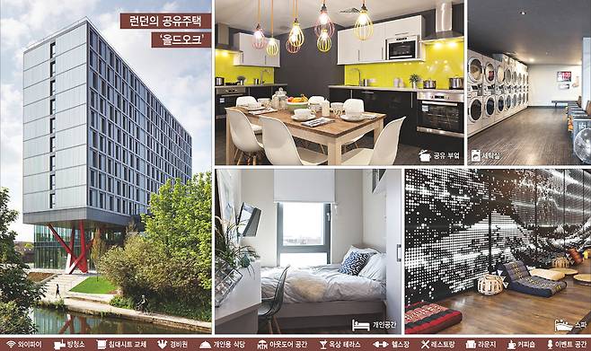 올드 오크는 입주자들에게 10㎡(3평) 크기의 아주 작은 방을 사적 공간으로 제공하는 한편, 나머지는 모두 공유공간으로 사용한다. 입주자들은 세련된 도서관에서 책을 읽을 수 있고, 최신 유행을 담고 있는 식당 시설도 이용할 수 있다. 극장에서 영화를 보거나, 게임방에서 보드게임도 즐길 수 있다. 체육관과 커뮤니티 라운지, 루프톱 정원 같은 아웃도어 공간도 있다. 이 모든 공간은 다른 입주자들과 함께 시간을 보낼 수 있는 공유공간이다. 이런 주거 형태를 두고, 일부에서는 “기숙사 같다”고도 말한다. 유럽의 기숙사들은 이런 식으로 꾸며져 있다. 그래서 영국 언론들은 올드 오크에 대해 “성인을 위한 기숙사”란 표현을 쓰기도 한다.