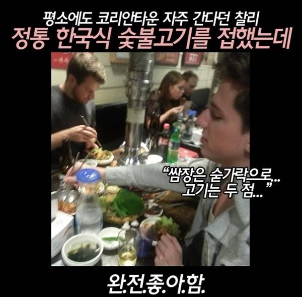 친구와 수다를 떠는 모습이었습니다. "대기실에 있던 과자와 티백이 너무 맛있었다", "한국 고깃집이 너무 좋아서 2번이나 다녀왔다"는 말들을 빠짐없이 했죠.