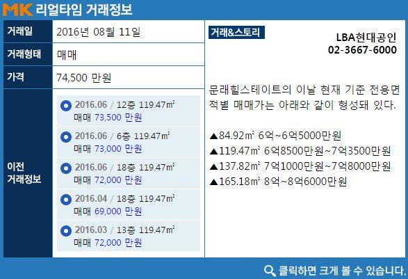 23일 부동산 업계에 따르면 LBA현대공인중개사는 지난 11일 영등포구 문래힐스테이트아파트 전용면적 119.47㎡(약 36.1평) 고층 매물을 7억4500만원에 매매 계약했다. 국토교통부 실거래자료를 기준으로 가장 최근 거래 건은 2016년 6월에 신고 된 12층 매매가 7억3500만원이다.