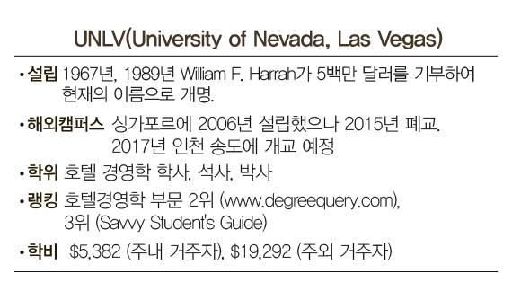 "무엇보다도 라스베이거스라는 입지입니다. 학교 졸업 전 호텔에서 1000시간 인턴 경험은 필수입니다. 학교 주변에 숙박, 컨벤션, 카지노 등으로 유명한 호텔이 가득합니다. 학교 주변이 다 실습장인 셈입니다. 2014년 기준 한국 전체 호텔 객실이 콘도를 합쳐서 14만실 정도입니다. 그런데 라스베이거스시에 있는 호텔 객실은 12만5000실 정도였습니다. 엑스 칼리버, 벨라지오나 MGM Grand 호텔 등은 객실이 각각 4000실 이상입니다. 우리나라에서 가장 큰 롯데호텔 소공점이 1300실 규모인 데 비하면 어마어마한 거죠."