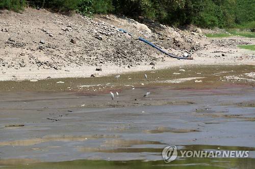 (진도=연합뉴스) 정회성 기자 = 전남 서남권 들녘에 가뭄이 이어지고 있는 23일 오후 왜가리 무리가 바닥을 드러낸 진도군 진도읍 동외저수지에 앉아 먹이를 찾고 있다. 2016.8.23