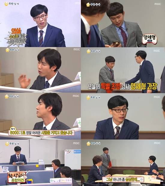 양세형은 '무한상사' 기존 팀원이 아닌, 타 부서의 양세형 과장으로 등장했다. 하버드대학교 방문판매학과를 졸업해 초고속 승진, 최연소 과장이 됐다는 설정이었다. 등장하자마자 트레이드 마크인 개인기, 유재석과 박명수 앞에서도 주눅들지 않고 딱밤을 때리는 용기와 깐죽거림으로 상황극에 자연스럽게 녹아들었다. 개그맨으로서 오랜시간 스탠딩 코미디를 해왔던 경험이 주효했다.