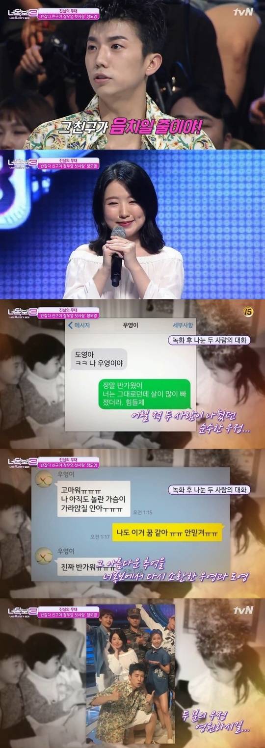 뒤이어 얼굴을 공개한 '장우영 첫사랑'을 본 장우영은 많이 변한 모습에 알아보지 못했다. 그도 그럴 것이 17년 만의 만남. 그러나 첫사랑이 과거 주고받은 쪽지와 장우영과 함께 찍은 사진이 담긴 앨범을 공개하자 장우영은 "내 친구 맞다. 도영이다. 그런데 살이 좀 쪘다"고 말하며 놀라움을 금치 못했다.