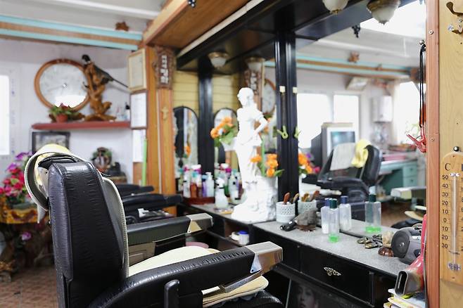 좁은 이발관도 갖가지 장식품으로 알록달록하다. 대형 거울 앞에는 하얀 조각상과 박제된 수꿩이 우뚝 서 있다. 날이 빠진 빗도 거울 앞을 차지하고 있다. 벽에 걸린 온도계와 진분홍 헤어드라이기도 정겹다. 비키니 차림의 여성을 모델로 한 주류회사의 달력 몇 장도 여러 해 지난 것이다.