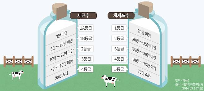 우리나라에서 우유의 원료가 되는 원유의 위생 등급을 결정하는 기준은 세균 수와 체세포 수 두 가지다. 세균 수는 원유가 얼마나 깨끗이 관리되느냐를 가늠하는 지표이고, 체세포 수는 젖소의 건강상태를 나타내는 척도이다. 일반적으로 우유 제품 패키지에 표기된 '세균 수 1A등급'은 세균 수 기준에서 최상위 등급을 받았다는 뜻이다. 체세포 수는젖소의 유방에 염증이 생기거나 노화·스트레스로 인해 호르몬 분비가 증가하면 많아진다.