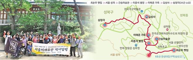 맑은 눈매의 주 할머니 곁에서 손을 꼭 붙들고 있는 딸 이수영(46)씨도 괜찮다는 뜻으로 고개를 끄덕였다. 이번 답사는 이씨가 신청해서 어머니를 모시고 나왔다. 일흔넷 할머니가 답사를 나오는 경우가 흔치 않았기에 사연이 있을 거라 짐작됐다. 나중에 물어보기로 마음먹고 문향(文香)의 거리 성북동 답사를 시작했다.