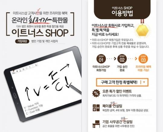 이번 기획된 쇼핑몰 이트너스샵에서는 회원사만의 특별 혜택으로 30%이상 할인 서비스, 삼성전자 노트PC 구매 시 사은품 증정, 페이롤 무료 컨설팅, 기업사무공간 무료 컨설팅 등 다양한 서비스가 제공된다.