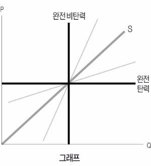 수요의 탄력성처럼 공급 탄력성이 무한대라면 완전 탄력적, 1보다 크다면 탄력적, 1과 같다면 단위 탄력적, 0보다 작으면 비탄력적, 0이면 완전비탄력적이다. <그래프 >가 그것이다.