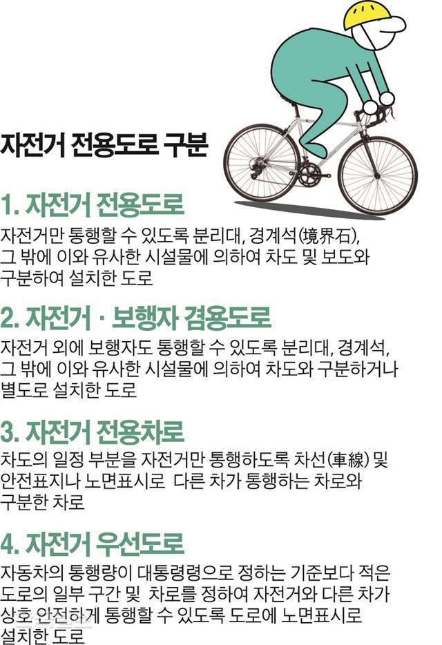 도로교통법상 규정에도 불구하고 많은 자전거 이용자들이 인도로 다니고 있다. 법에서 정하는 대로 자전거를 이용했다간 자신의 안전이 심각하게 위협받기 때문이다. 우리나라 도로는 자전거가 이동할 수 있는 공간이 따로 마련되지 않은 곳이 대부분이다. 자동차와 도로를 함께 사용해야 하는 경우가 많다. 작은 충격에도 균형을 잃고 쓰러질 수 있는 자전거가 위험할 수밖에 없는 환경이다.