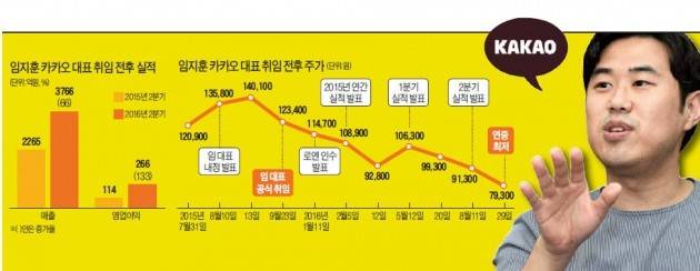 반면 기대를 모았던 O2O 사업에서는 부진을 면치 못하고 있다. 카카오의 첫 O2O 수익 모델로 기대를 모았던 카카오 드라이버는 지난 5월 말 출시 때부터 고가 요금 논란에 직면하면서 대리운전 시장 점유율이 8%에 머물고 있다. 기존 카카오 매출에서 가장 큰 비중을 차지한 광고 수익도 지난해 4분기 이후 전년 동기 대비 10% 안팎의 감소세가 이어지고 있다. 임 대표 취임 당시 12만3400원이던 주가는 5일 현재 8만1000원으로, 1년여 만에 34.35% 급락했다.