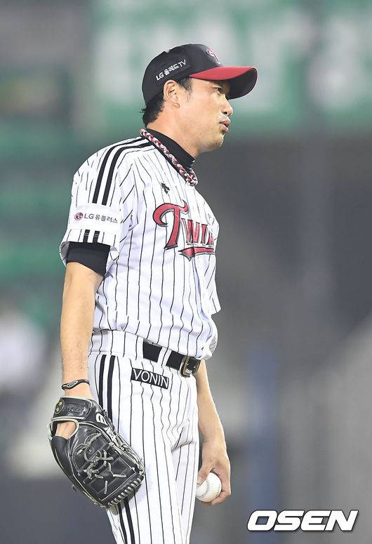 [OSEN=잠실, 곽영래 기자] 6일 오후 서울시 잠실야구장에서 '2016 타이어뱅크 KBO 리그' LG 트윈스와 넥센 히어로즈의 경기, 6회초 무사 1루 LG 봉중근이 강상수 코치가 마운드에 오르자 아쉬워하고 있다./ youngrae@osen.co.kr