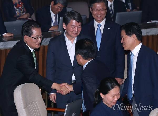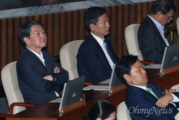 국민의당 안철수 전 대표가 7일 오전 국회 본회의장에서 박지원 비대위원장의 교섭단체 대표연설을 듣고 있다. 박 비대위원장이 연설을 마치고 자리로 돌아오자 안철수 전 대표 등 국민의당 의원들은 전원 자리에서 일어나 맞이했다.