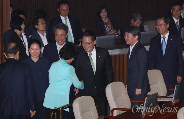 | ▲ 박지원 맞이한 국민의당 박지원 국민의당 비대위원장이 7일 오전 국회 본회의장에서 교섭단체 대표연설을 마치고 자리로 돌아오자 안철수 천정배 전 공동대표와 김성식 정책위의장 등이 일어나 인사하고 있다. |