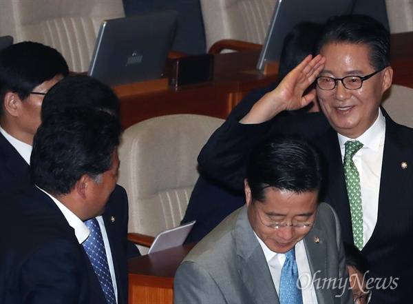 | ▲ 거수경례한 박지원 박지원 국민의당 비대위원장이 7일 오전 국회 본회의장에서 교섭단체 대표연설을 마치고 자리로 향하며 인사하는 동료의원들에게 거수경례를 하고 있다. |