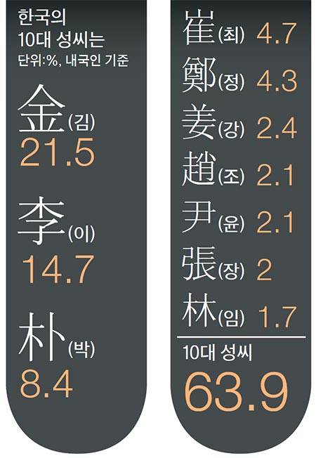 한국인 45%가 김·이·박씨..한자 없는 성씨가 4075개