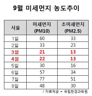 지난 주말 미세먼지 농도는 3일(21㎍)과 4일(22㎍) 이달 최저 수준을 기록했다. 같은 날 초미세먼지도 마찬가지로 각각 13㎍로 이달 최저치다.